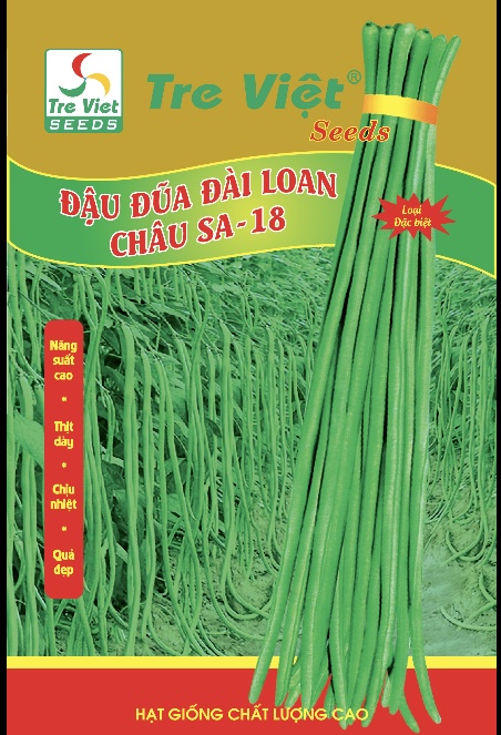 – Đặc tính giống: Đậu Đũa Đài Loan Châu Sa -18 là giống đậu đủa được nhiều người ưa chuộng theo hướng năng suất cao, trái xanh dài bóng đẹp, cây sinh trưởng phát triển khỏe, chịu nhiệt, kháng bệnh tốt, hạt nhỏ, thịt dày, màu xanh trung binh, dãi 60 -80cm.