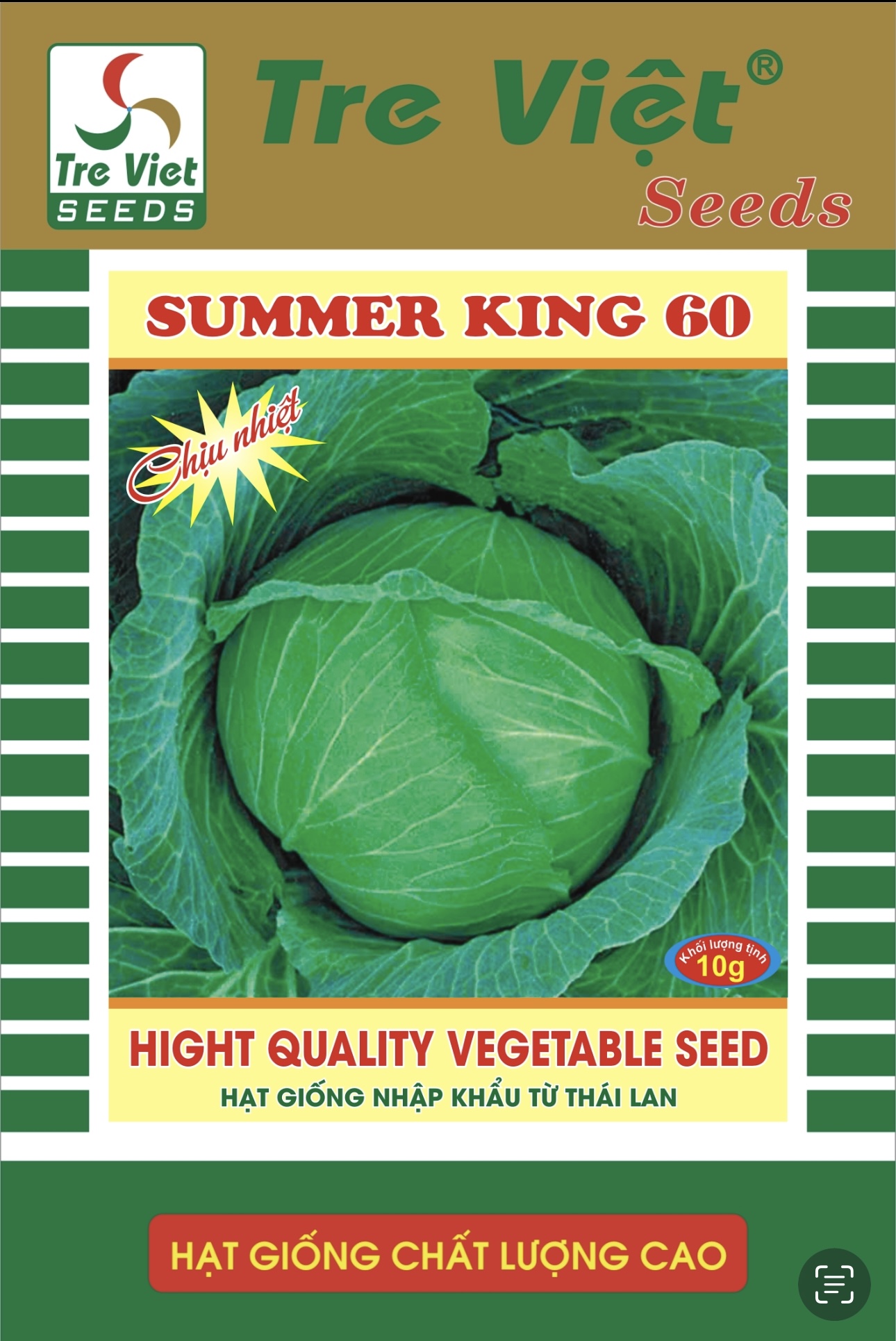 - King 60, còn có tên gọi khác là Hoa Xanh Mùa Hạ. Là giống Bắp Cải Lai F1 được nhập khẩu. Giống có thời gian sinh trưởng ngắn Thu hoạch 55-60 ngày sau trồng. Bắp có hình cầu hơi dẹt, lá đóng kín màu xanh rất đẹp, có trọng lượng từ 1,8-2,8 kg rất phù hợp với việc tiêu thụ của người dân Việt Nam, Phổ rộng Chịu nhiệt cao, cả khi nhiệt độ lên tới 35 0C Bắp vẫn cuốn tốt, có thể trồng được ba vụ trong năm, Bắp cuốn chắc xanh bóng, gọn cây, giống có khả năng kháng bệnh thối đen rất tốt và chịu hạn cao, kiểu hình cây rất đẹp, năng suất cao, ăn ngon vị ngọt, hương thơm và lâu xuống mã khi vận chuyển xa, nên giống này thương mại tuyệt vời được các thương lái và người tiêu dùng ưa chuộng.