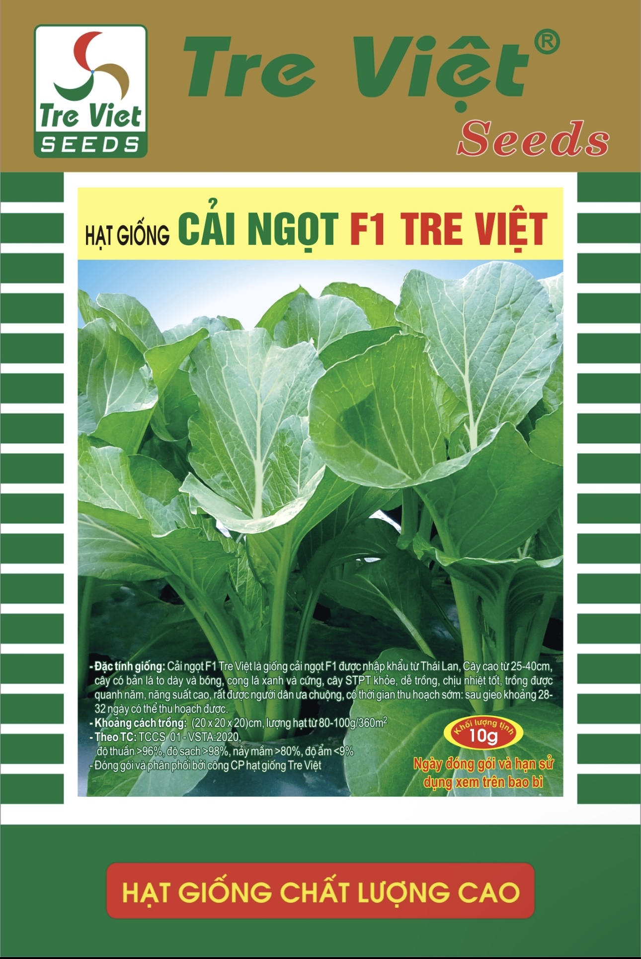 -Đặc tính giống: Cải ngọt F1 Tre Việt là giống cải ngọt F1 được nhập khẩu từ Thái Lan, Cây cao từ 25-40cm, cây có bản lá to dày và bóng, cọng lá xanh và cứng, cây STPT khỏe, dễ trồng, chịu nhiệt tốt, trồng được quanh năm, năng suất cao, rất được người dân ưa chuộng, cổ thời gian thu hoạch sớm: sau gieo khoảng 28-