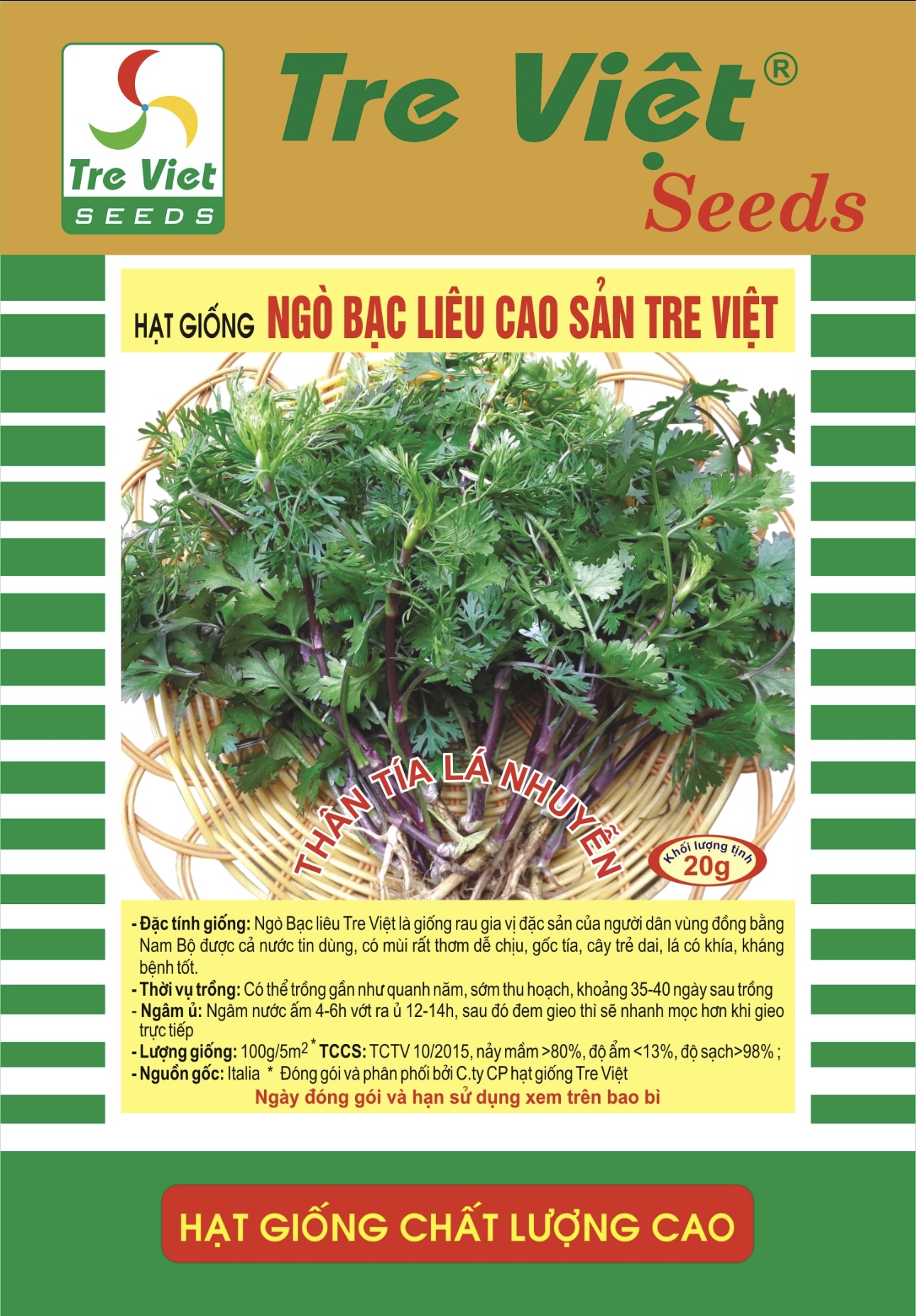 • Lượng giống: 100g/5m2* TC: 17-VSTA 2020, nảy mầm >80%, độ ẩm <13%, độ sạch>98% ;